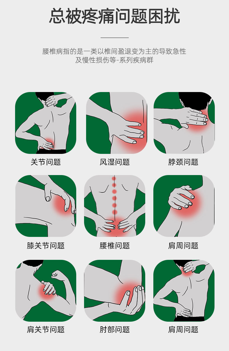【适用范围】该产品可促进局部血液循环、辅助消炎、消肿和止痛。用于肩周炎、 关节炎(非急性期)、颈椎病、腰椎间盘突出、腰肌劳损、骨质增生、腱鞘炎、 扭挫伤(非急性期)引起不适症状的辅助治疗。