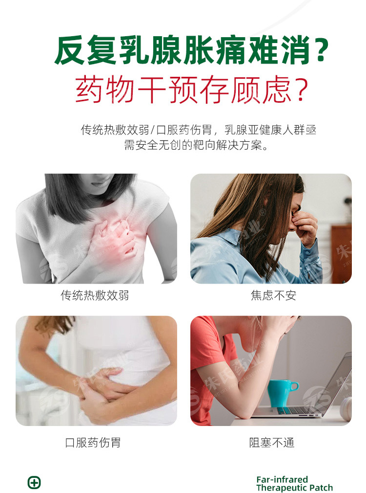 【适用范围】该产品用于穴位敷贴,通过物理原理缓解乳腺小叶增生引起的胀痛。