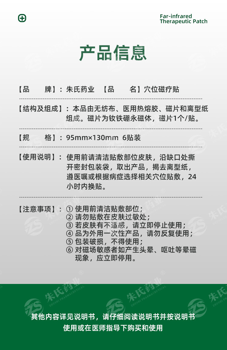4、本品为 外用一次性产品,请勿反复使用;5、包装破损,不得使用;6、对磁场敏感者如产生头晕、呕吐等晕磁现象,应立即