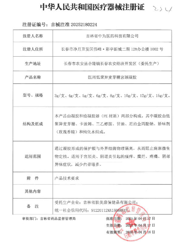 公司 医用低聚异麦芽糖宫颈凝胶成功获批二类医疗器械注册证,进一步丰富了妇科健康产品线。以下是该产品的核心信息及企业背景: