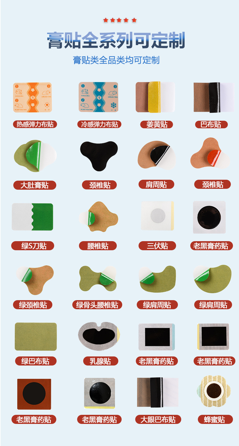 支持蚕丝布、PU膜贴等高端包装设计,适配电商、医疗等多渠道需求。例如骨科贴剂采用传统黑膏药工艺结合现代透皮技术,通过非遗认证提升文化溢价。