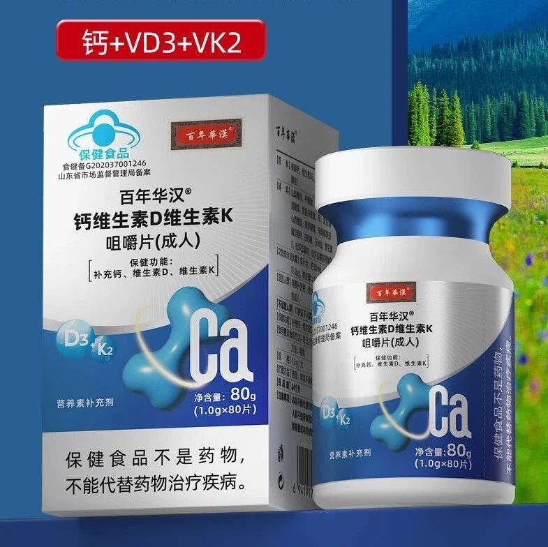 你是否经常感到腰酸背痛,爬楼梯时膝盖隐隐作痛? 稍微运动就容易抽筋, 甚至发现自己的身高在不知不觉中 “缩水”? 别以为这些只是小毛病,它们很可能是身体在向你 发出缺钙的信号!对于成年人来说,钙是维持骨骼健康、 保证身体正常运转的关键元素,但单纯补钙往往效果不佳, 因为钙的吸收和利用离不开维生素 D 和维生素 K 的协同作用。 今天,就为大家带来一款科学配比的补钙神器 ——百年华汉 ® 钙维生素 D 维生素 K 咀嚼片(成人), 为你的健康保驾护航!
