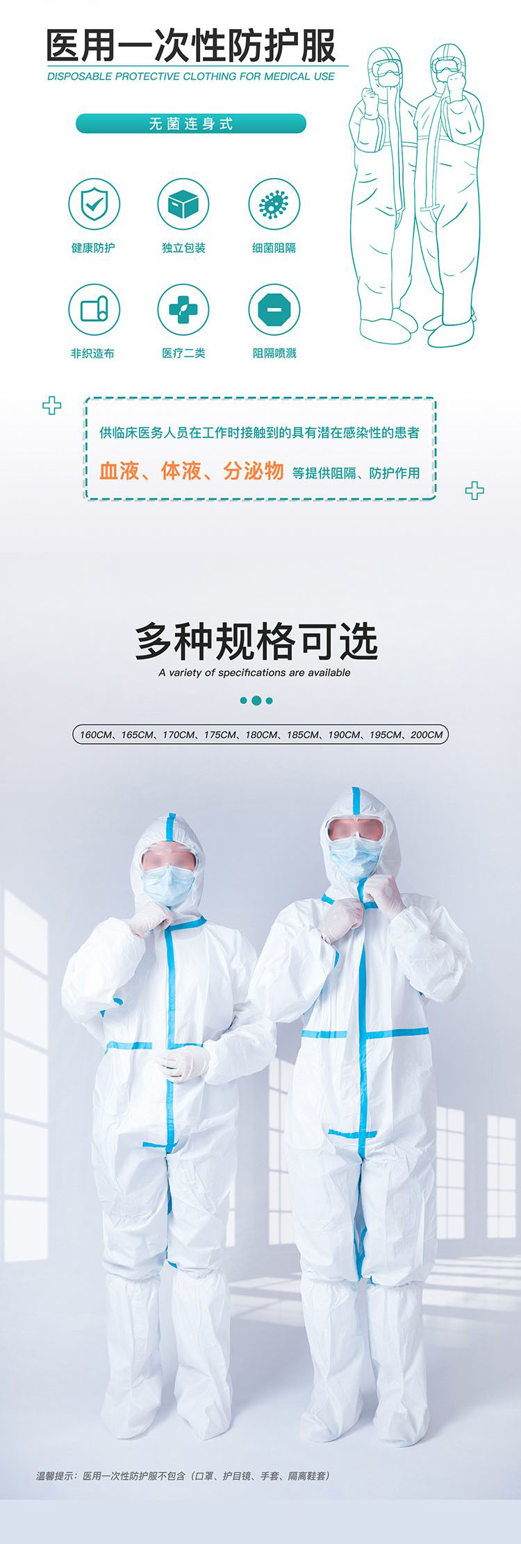 【型号规格】型号:无菌连身式;规格:160cm、165cm、170cm、175cm、180cm、185cm、190cm、195cm、200cm。
