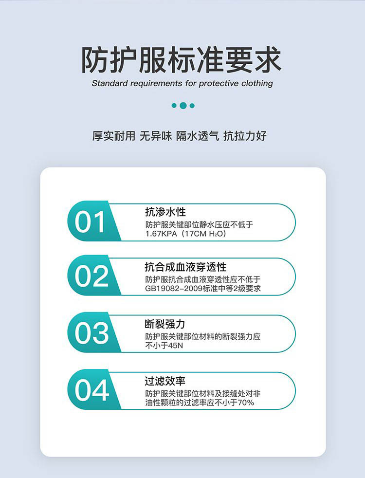 【适用范围】供临床医务人员在工作时接触到的具有潜在感染性的患者血液、体液、分泌物等提供阻隔、防护用。