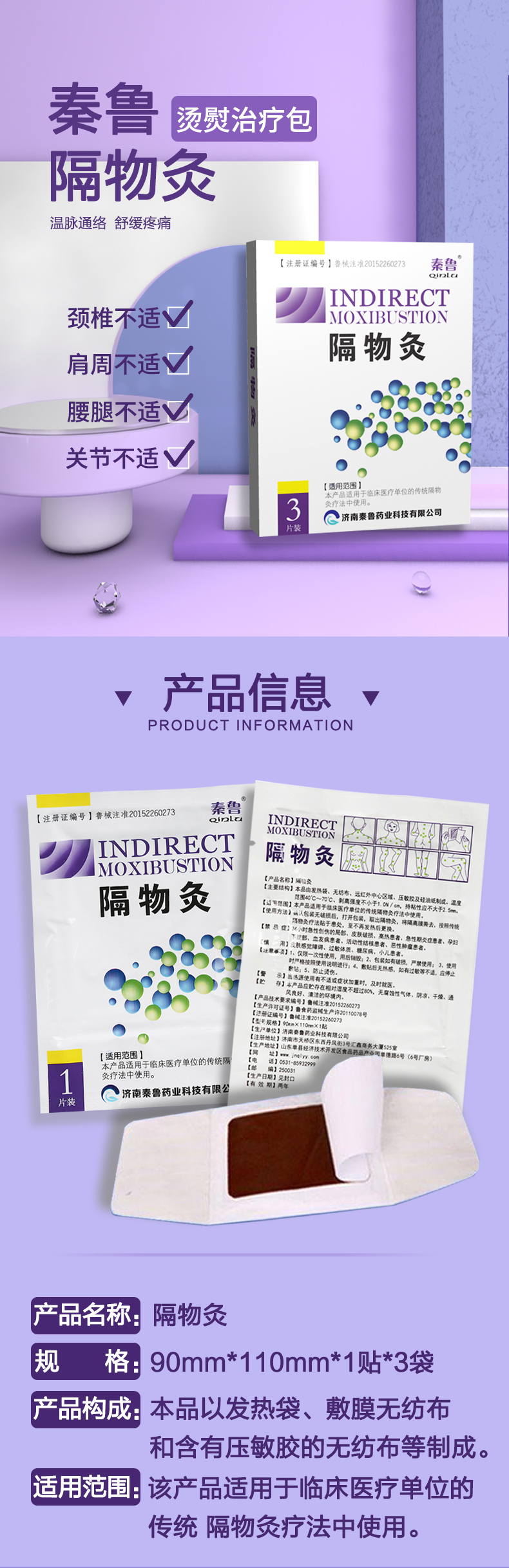 【使用方法】确认包装无破损后,打开包装,取出隔物灸,将隔离膜撕去,按照传统隔物灸疗法贴于患处,至不在发热后更换。
