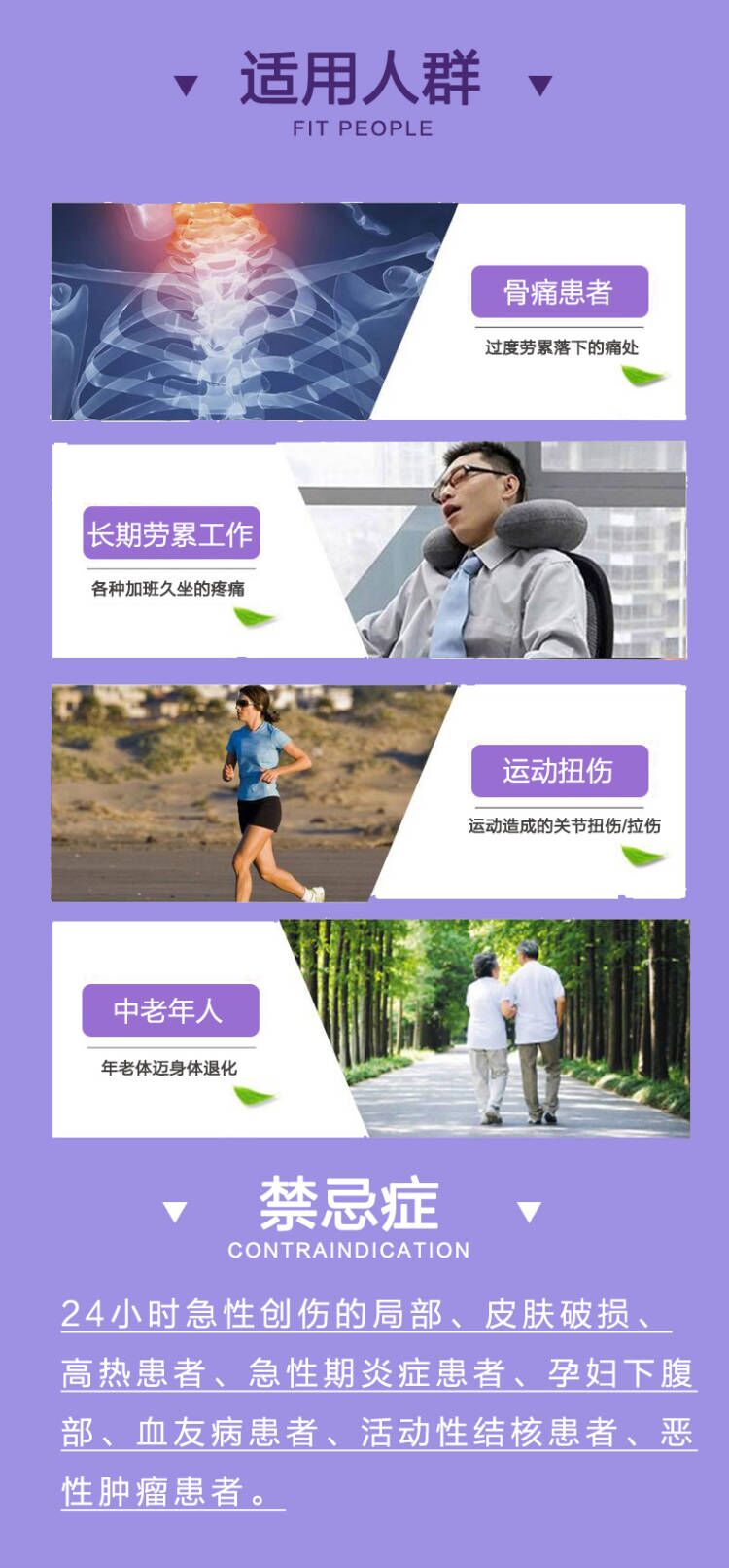 【禁 忌 症】24小时急性创伤的部位、皮肤破损、高热患者、急性炎症患者、孕妇下腹部、血友病患者、活动性结核患者、恶性肿瘤患者。