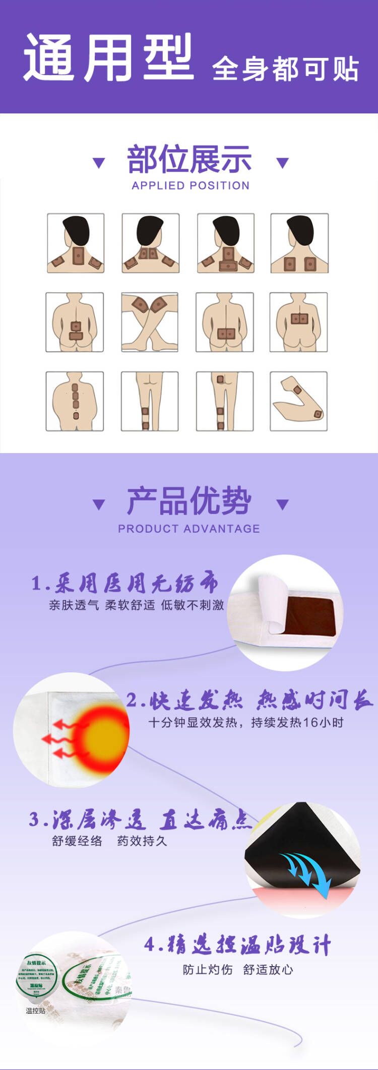 【注意事项】1、仅限一次性使用,用后销毁;2、包装如有破,损严禁使用;3、使用时严格按照使用说明书进行;4、敷贴后无热感,如有不是,停止敷贴;5、防止烫伤。