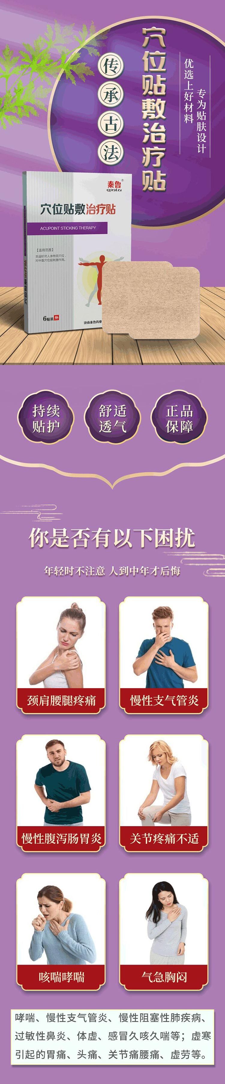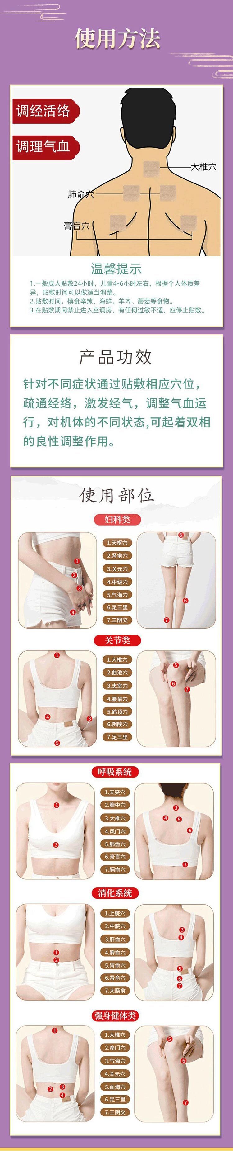 【使用方法】清洁相应穴位先以拇指依次揉按相应穴位,每穴1—2分钟,范围由小到大,力量由轻到重,探寻敏感点。2、确认包装无破损后,打开包装,取出穴位贴敷治疗贴,将隔离膜撕去,以钢珠对准相应穴位敏感点贴压,1片/穴/天,每日适度按压3—5次,每次3-5分钟,1个疗程为10天,疗程间隔2-3天。