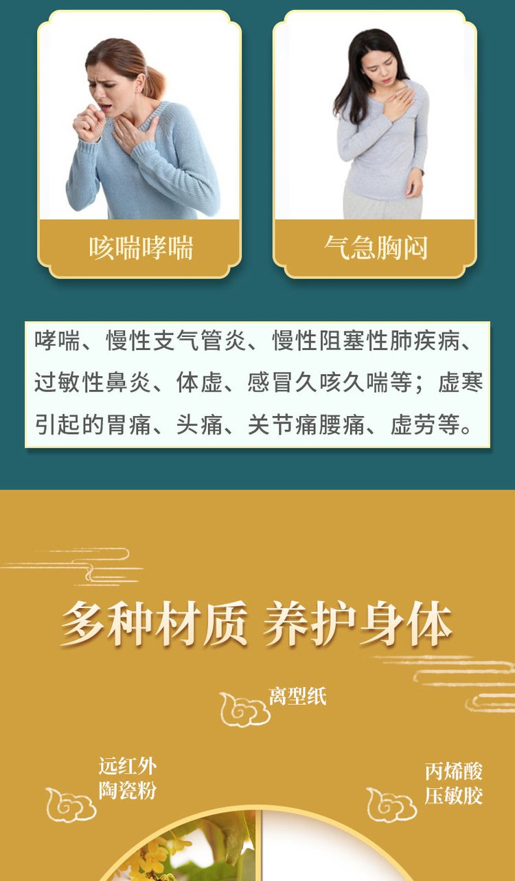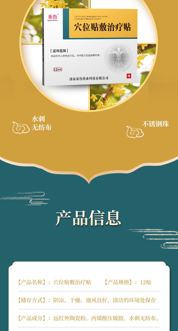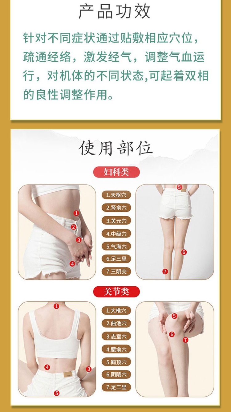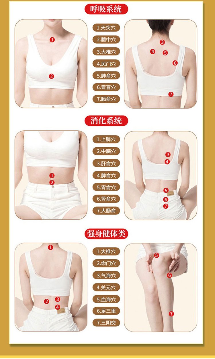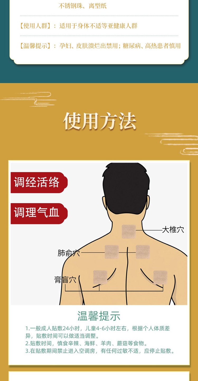【使用方法】清洁相应穴位先以拇指依次揉按相应穴位,每穴1—2分钟,范围由小到大,力量由轻到重,探寻敏感点。2、确认包装无破损后,打开包装,取出穴位贴敷治疗贴,将隔离膜撕去,以钢珠对准相应穴位敏感点贴压,1片/穴/天,每日适度按压3-5次,每次3-5分钟,1个疗程为10天,疗程间隔2-3天。