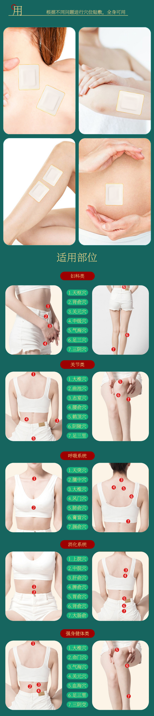 【使用方法】清洁相应穴位先以拇指依次揉按相应穴位,每穴1—2分钟,范围由小到大,力量由轻到重,探寻敏感点。2、确认包装无破损后,打开包装,取出穴位贴敷治疗贴,将隔离膜撕去,以钢珠对准相应穴位敏感点贴压,1片/穴/天,每日适度按压3—5次,每次3-5分钟,1个疗程为10天,疗程间隔2-3天。