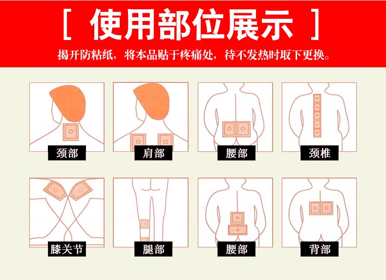 【使用方法】清洁患处,取出贴剂揭开防粘,将胶面贴于患处,轻轻按压即可,每24小时更换一次