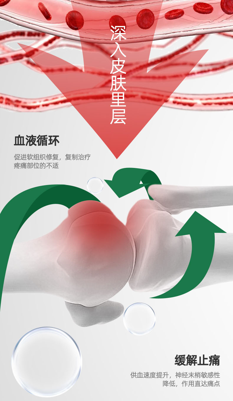 【适用范围】该产品可促进局部血液循环、辅助消炎、消肿和止痛。用于肩周炎、 关节炎(非急性期)、颈椎病、腰椎间盘突出、腰肌劳损、骨质增生、腱鞘炎、 扭挫伤(非急性期)引起不适症状的辅助治疗。
