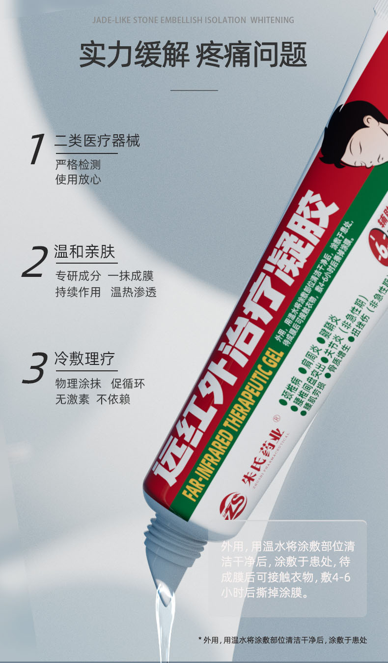 【使用说明】外用,用温水将涂敷部位清洁干净后,涂敷于患处,待成膜后可接 触衣物,敷 4-6 小时后撕掉涂膜。