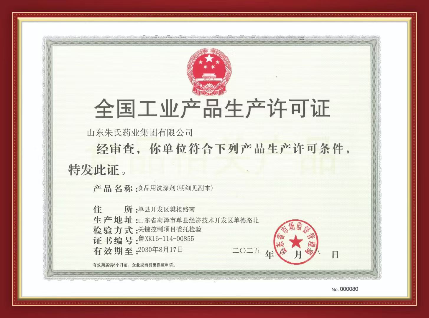 食品用洗涤剂与我们的日常生活息息相关,从餐具清洁到果蔬去农残,洁净度直接关系到家人的饮食健康。此次集团获得的生产许可证,历经多环节严格审核,每一项标准都紧扣国家食品要求。证书明确标注,产品名称为食品用洗涤剂,食品工业用(含复合主剂)手洗餐具用、机洗餐具用洗涤剂。检验方式采用关键控制项目委托检验,证书编号为鲁 XK16-114-00855,有效期至 2030 年 8 月 17 日。这一串清晰、规范的信息,不仅是对集团生产实力的肯定,更是集团对消费者 品质至上” 的郑重承诺。