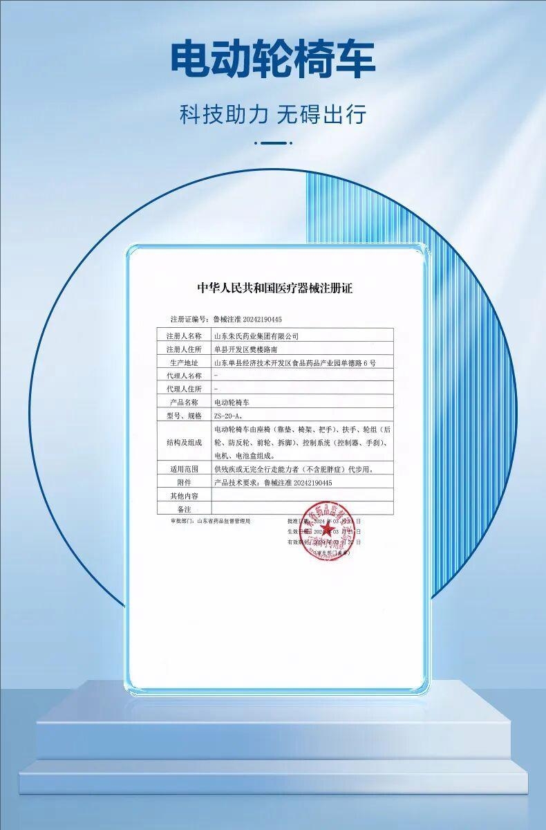 近日,经山东省药品监督管理局审批通过,山东朱氏药业集团Ⅱ类医疗器械“电动轮椅车”正式获得《中华人民共和国医疗器械注册证》。